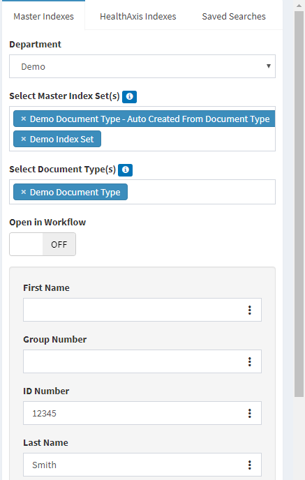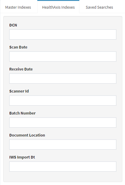 The HealthAxis Indexes are available if the current/selected department uses the HealthAxis vendor for the scanning of documents into IWS. These special fields are available to help department admins and users find documents based on the batch and document information HealthAxis provided when they sent the scan batch to HealthSmart. Typically, these are used when there is an issue finding a document that HealthAxis provided originally, and they have sent the DCN or scan date info to help research.