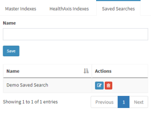 - Name: After entering search criteria in the Master Indexes and/or HealthAxis Indexes tabs, that criteria can be saved with a specific name. Enter the name of this search in this field and click the Save button to save the search for future use.