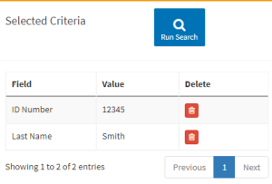 - List of Criteria: The list will display a summary of any index field criteria that has been entered for the search. This section is read only, but an element can be deleted from the criteria using the delete icon.
