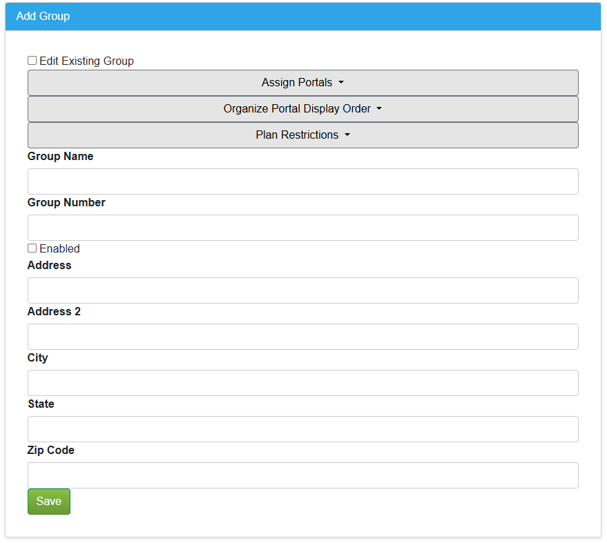 • Portal Plan Restrictions:  This section will not be available until the entire portals have been assigned and after the entire new group record has been saved.