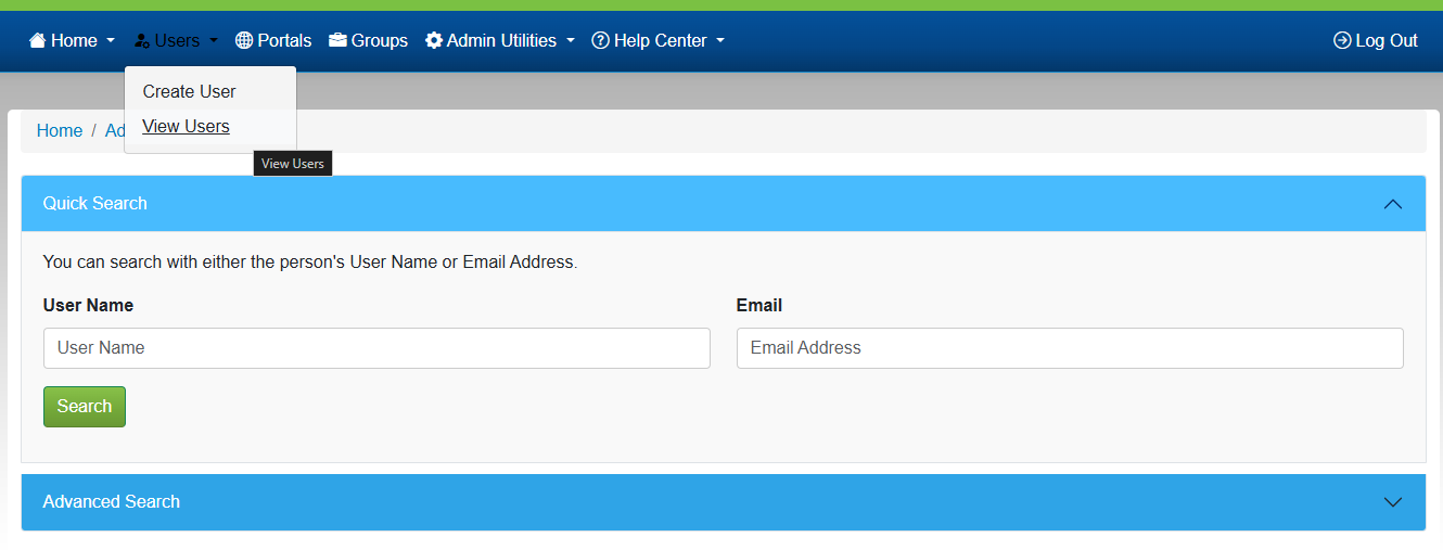 The View Users is the default option selected when entering the admin area. The system selects it from the menu by default. In this screen, we can find any existing myHealth user accounts.