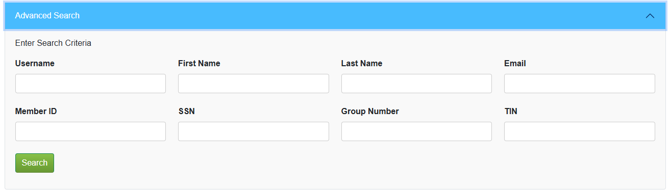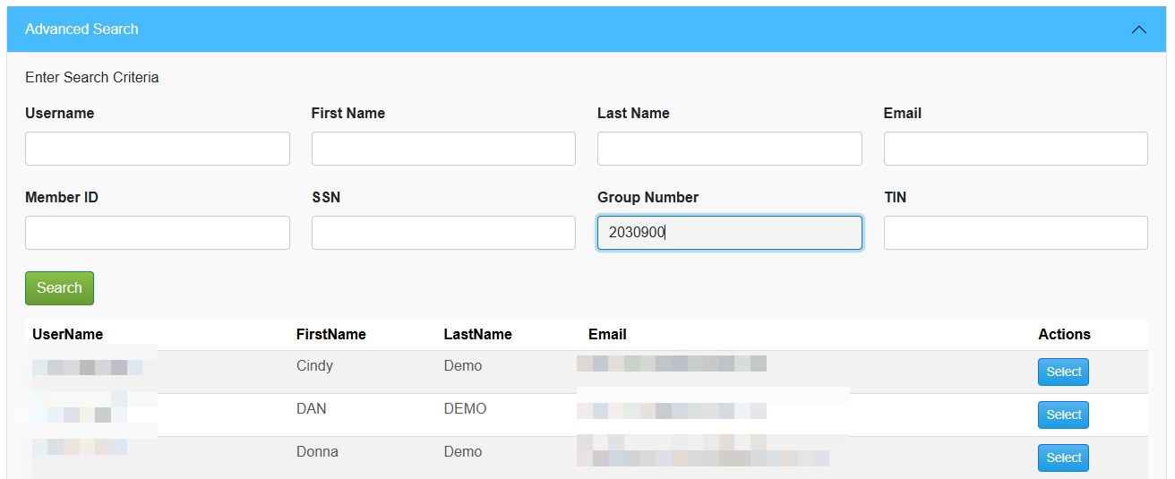 - Group Number: Find the account by the user's associated group number (only member records with associated client group identities will be returned).
