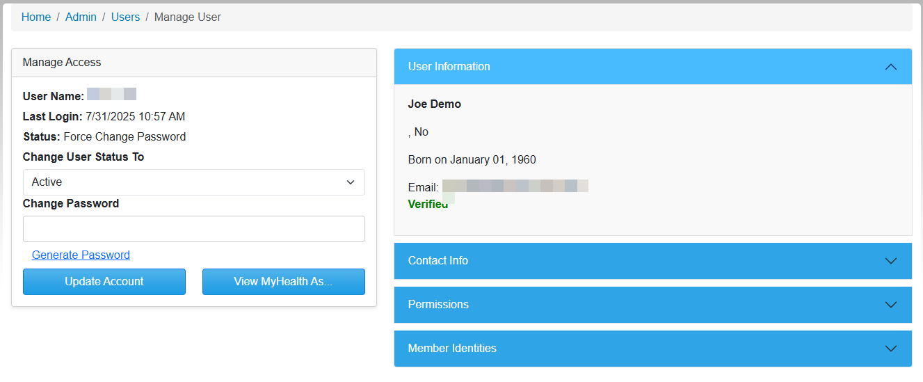 - View myHealth As User: The system will open a new browser tab and display the myHealth portal imitating the user record that was open.