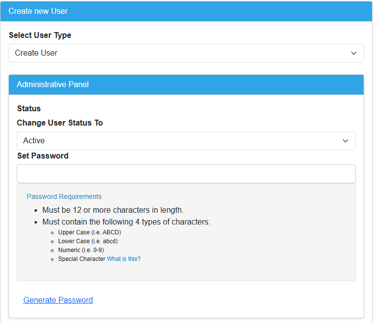 - Set Password: Assign a password for the new user that meets the requirements displayed or use the Generate Password option.