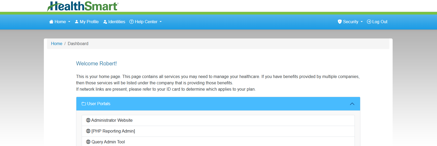 The home screen and menu option are the initial landing page for myHealth. This screen provides welcome information and links admin functions that are available to the logged in admin account. Depending on the level of access assigned, there may be multiple options available. The admin user may also see member/employer identity options in the list if the account has a member identity for testing.