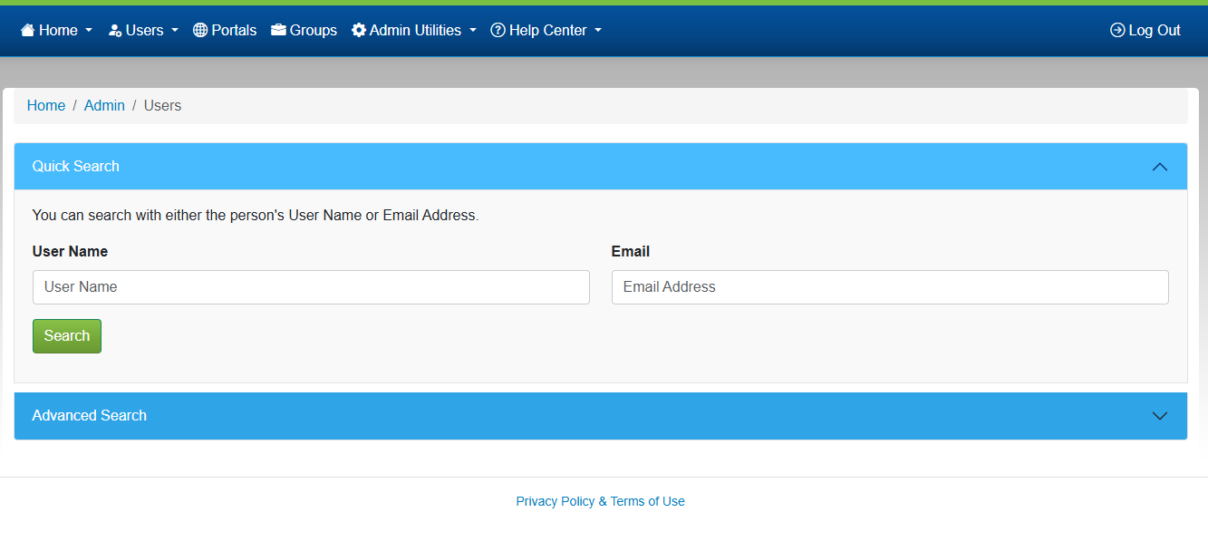 - By default, the Users search is opened and displayed in the main panel.