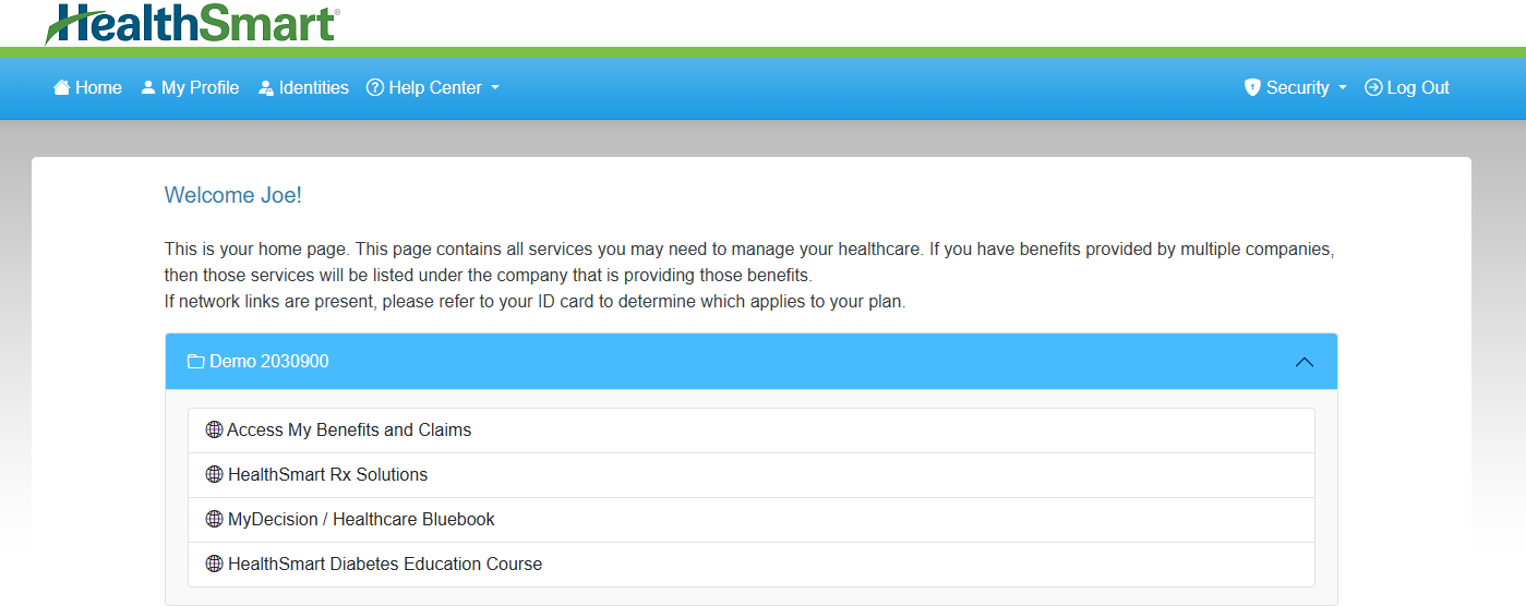 The home screen and menu option are the initial landing page for myHealth. This screen provides welcome information and links to other HealthSmart systems and vendor services.