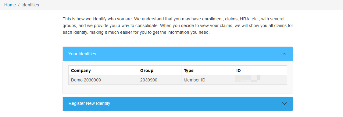 The Identities screen in myHealth allows users to add additional employer group/university identities to the existing myHealth account.  In the event that a member has changed groups or has a secondary group for separate benefits, other identities can be added on this screen to allow access to the benefits for all identities from one myHealth account.