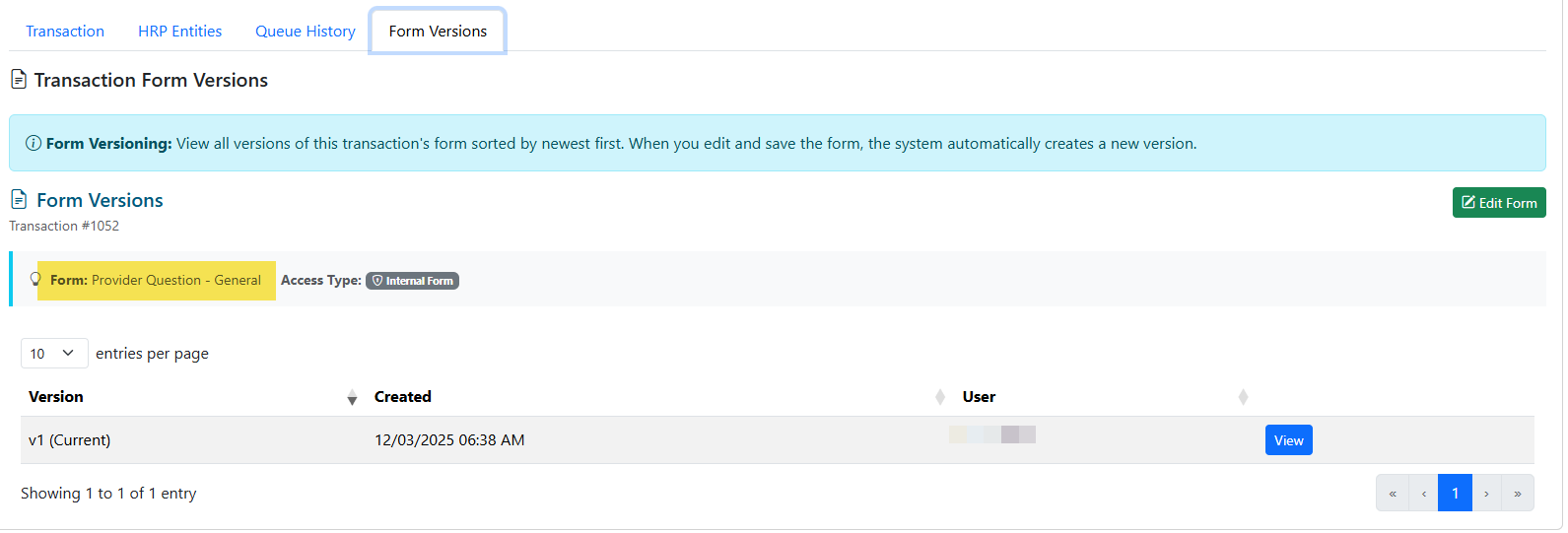 - All transactions are questions or forms and the details will be shown on the Form Versions tab.