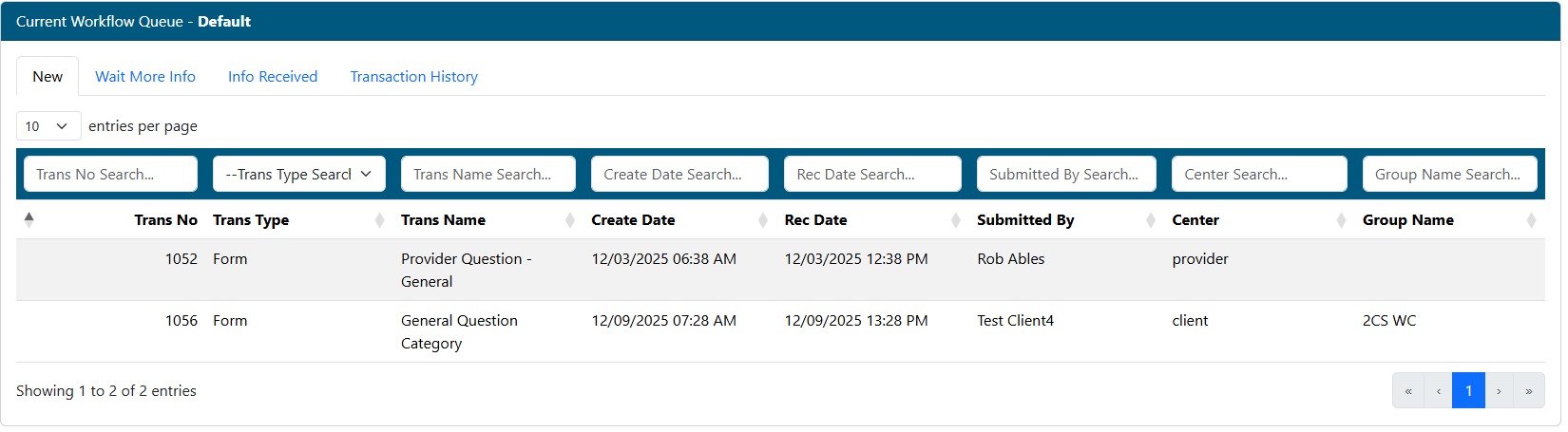 - The tabs at the top of the queue list show different transaction types: NEW, WAIT MORE INFO, INFO RECEIVED, and TRANSACTION HISTORY.