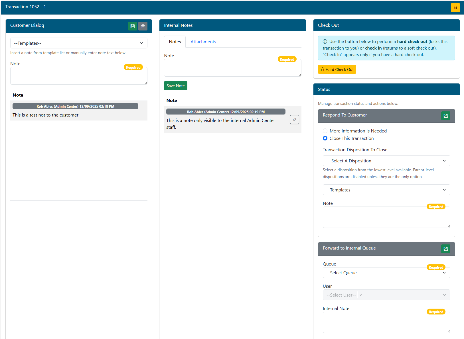 - These notes are only seen by internal Admin Center users. Use these notes to communicate internal information regarding this transaction to the next Admin user that may review this transaction.