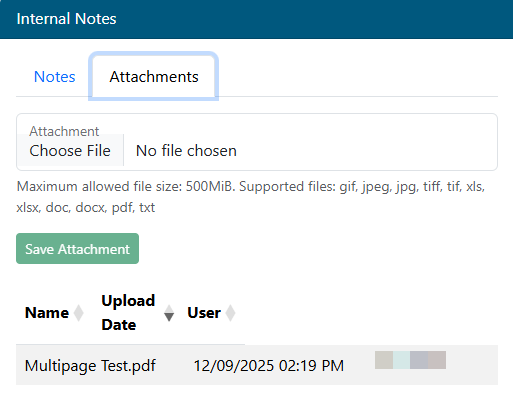 - A record of the attachment name, upload date, and user that completed the attachment will be shown .