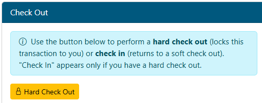 - 1 - The user that performed the hard check out checks in back in using the Check In button (only displayed if the transaction is already in a hard check out status).