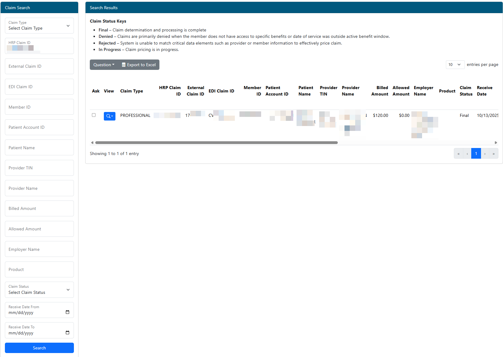 - Searching Claims - Claims can be filtered by typing in search criteria in the left Claim Search panel.