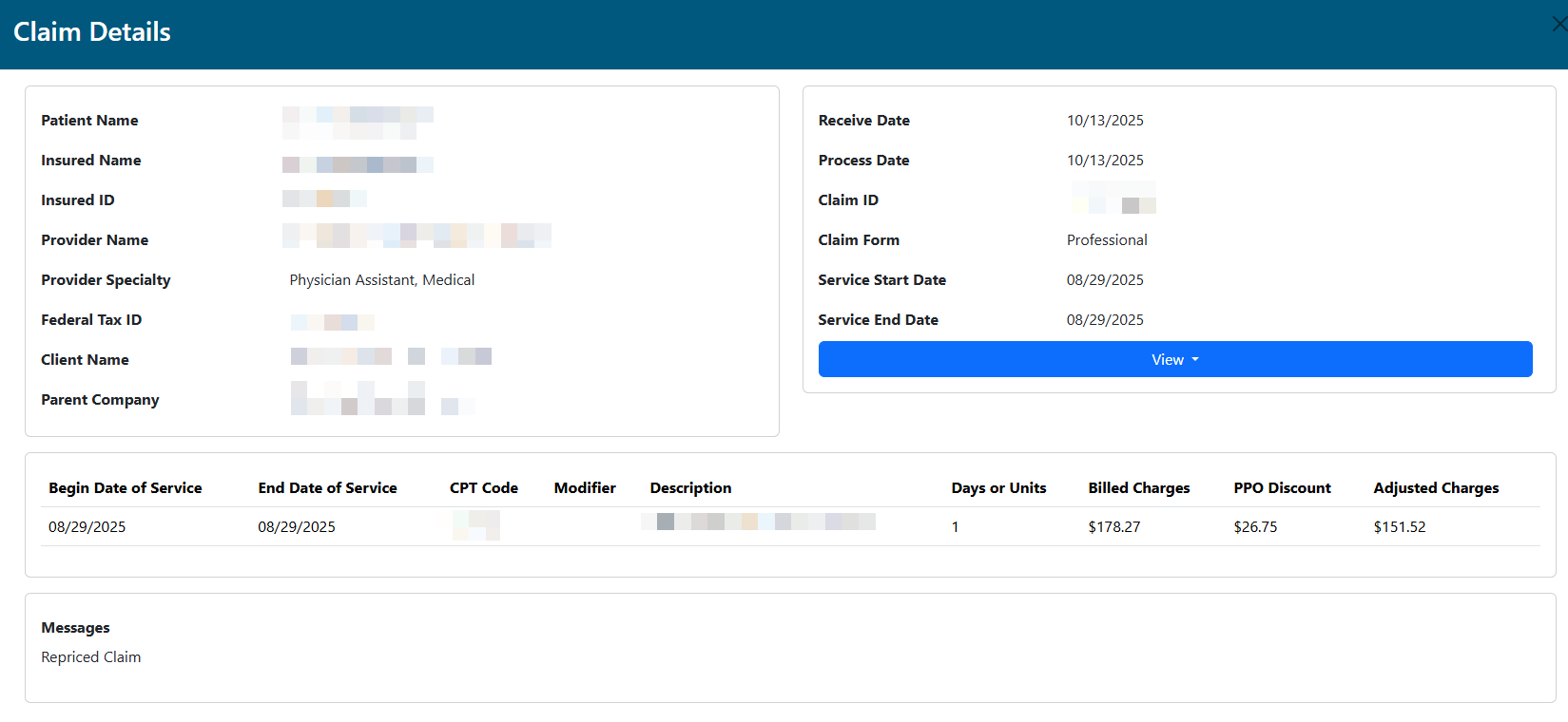 - View - The View button provides a selection of claim related documents like Claim Forms and Repricing Sheets.