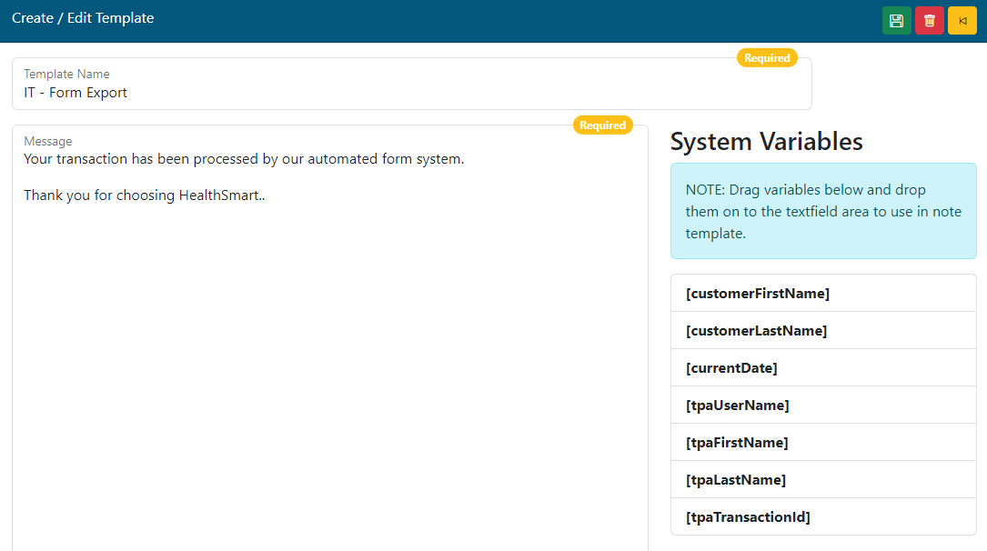 - System Variables: Keyword variables can be inserted into the MESSAGE text area to provide specific information in the message regarding the transaction and some user information.