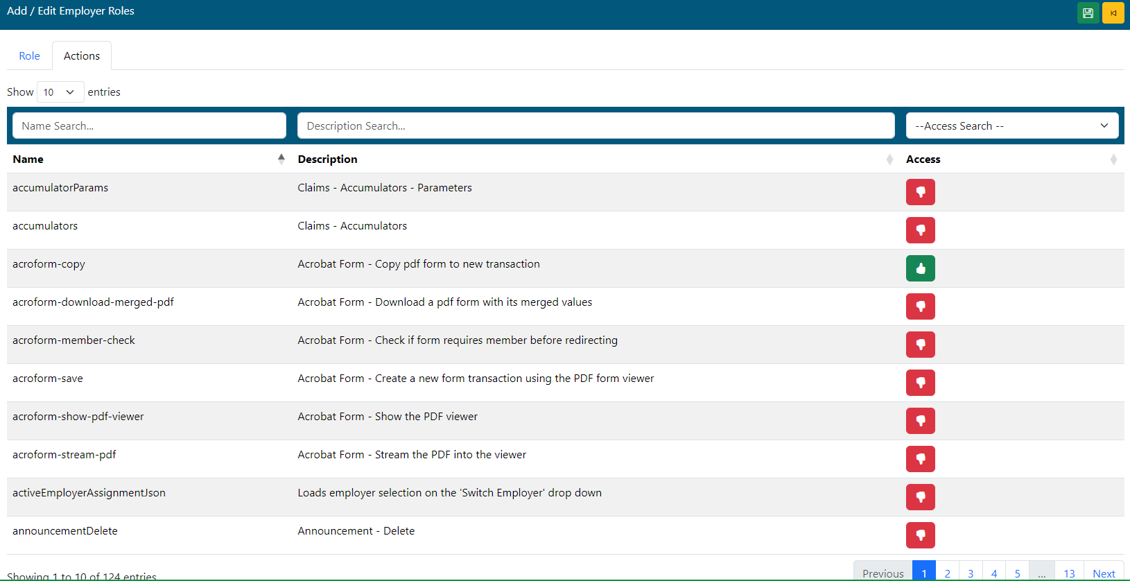 • Listed will be all available "actions" in the Employer Center.  Change the Access column icon to yes (thumbs up) for those actions this role will be allowed to perform.