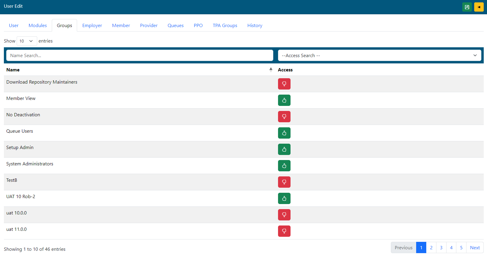 - Change the ACCESS column icon to GREEN (thumbs up) to grant access to that Group for this user.