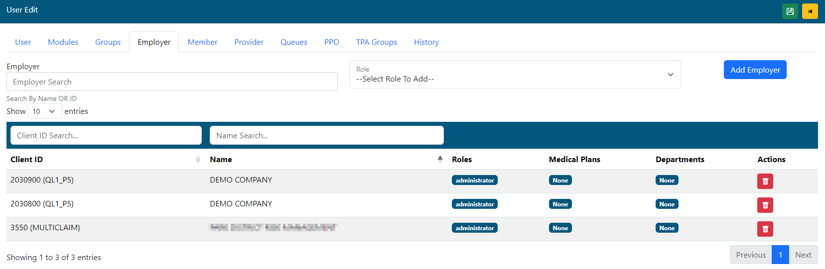- Allow access to the EMPLOYER CENTER to specific Employer groups for this user. Multiple groups can be added one by one if this user is permitted to access them. Brokers, Client Services TPA Users, etc. usually have access to multiple Employer groups.