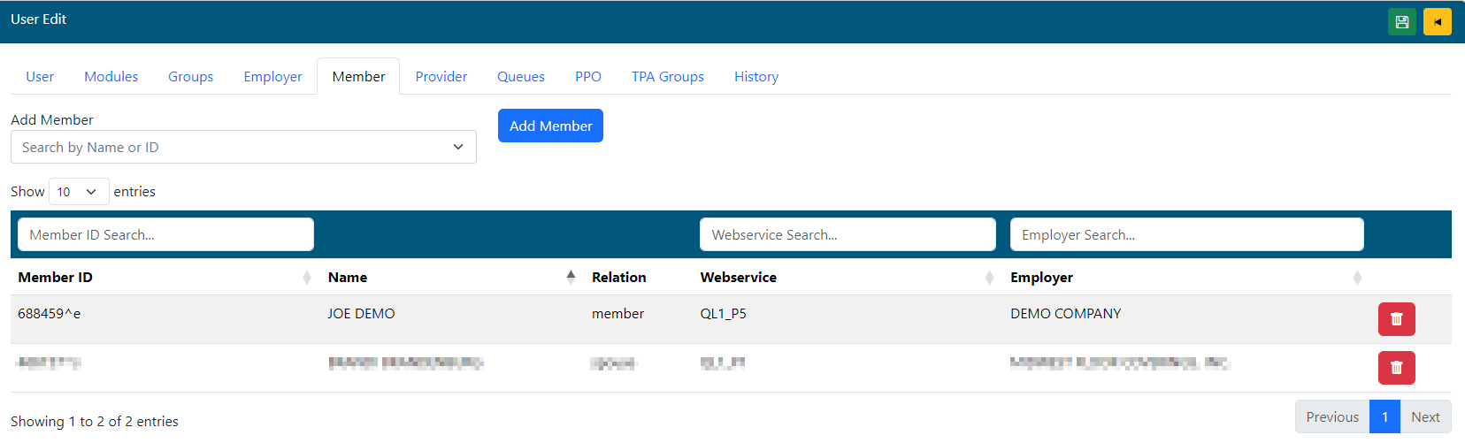 - Allow access for this user to the MEMBER CENTER for specific Members. Multiple members can be added if the user is permitted. This is usually only modified for TPA user testing, or for Members that have moved Employer groups, and need to have an additional Member key added here manually.