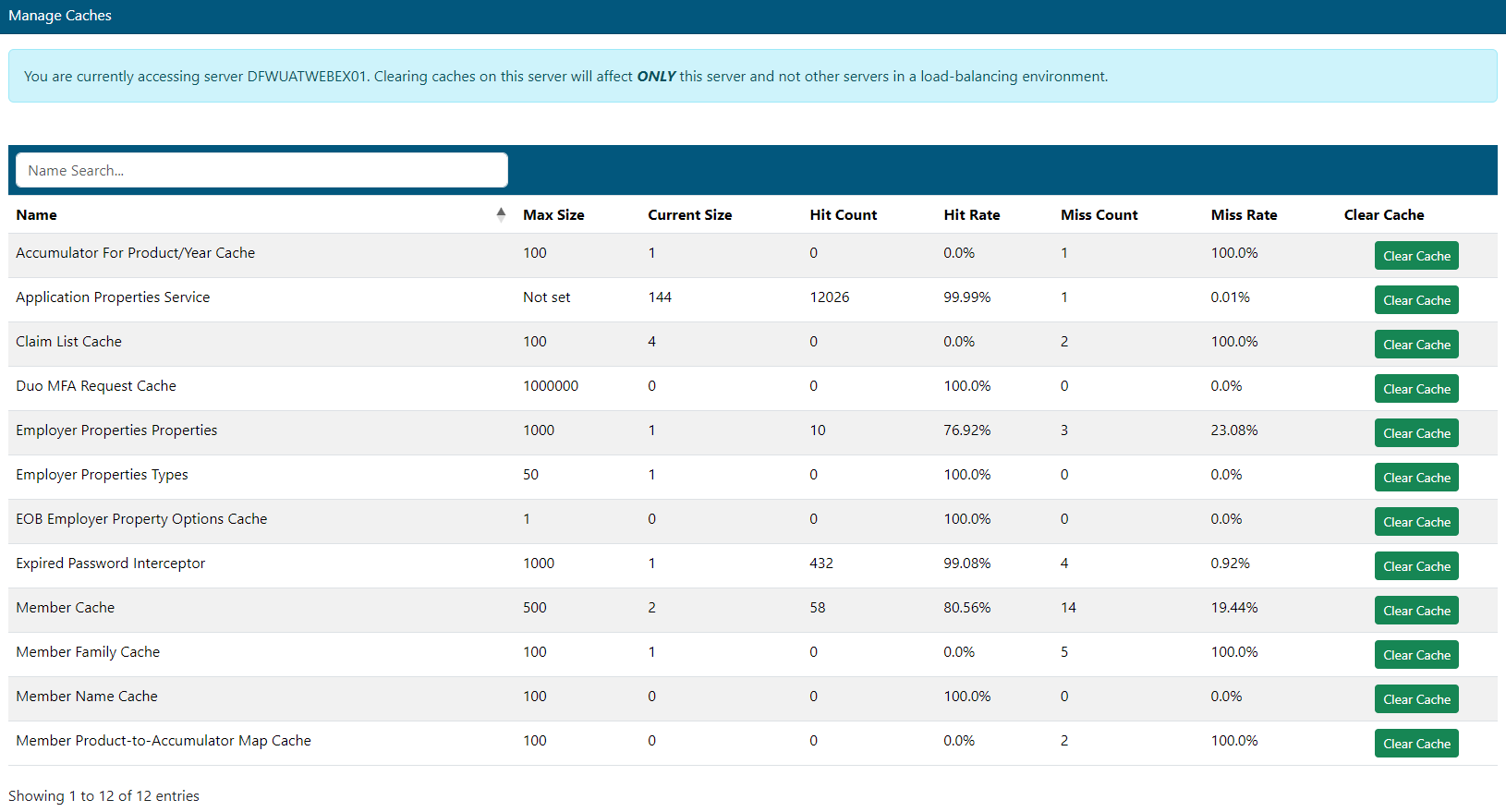 • Clear Cache: The Clear Cache button in each row will empty that particular cache on that server immediately.