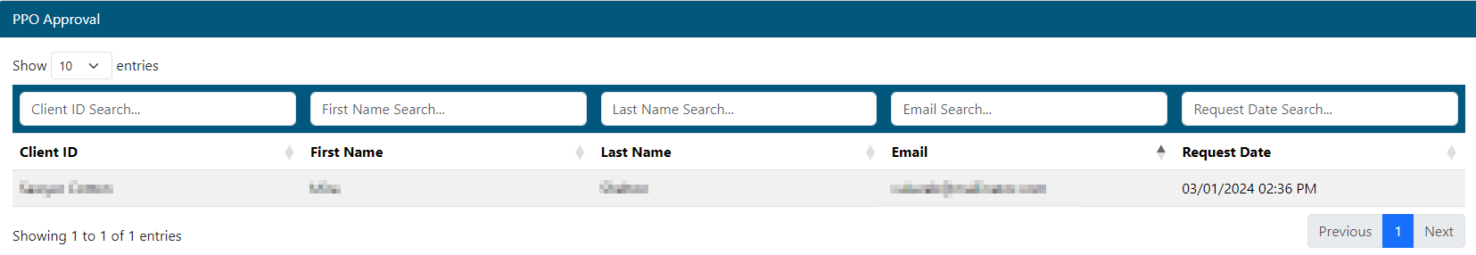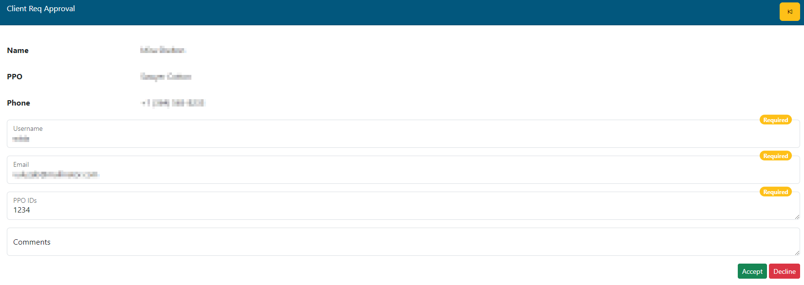 - If access is approved, enter the internal system PPO IDs this user will have access to, add any comments, and click ACCEPT.